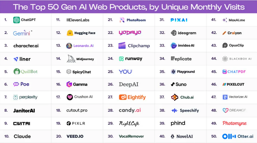 美国知名的私人风险投资公司a16z,基于SimilarWeb的流量数据(截至2023年6月),对现在市场上访问量前50名的GenAI网络产品进行了排名。